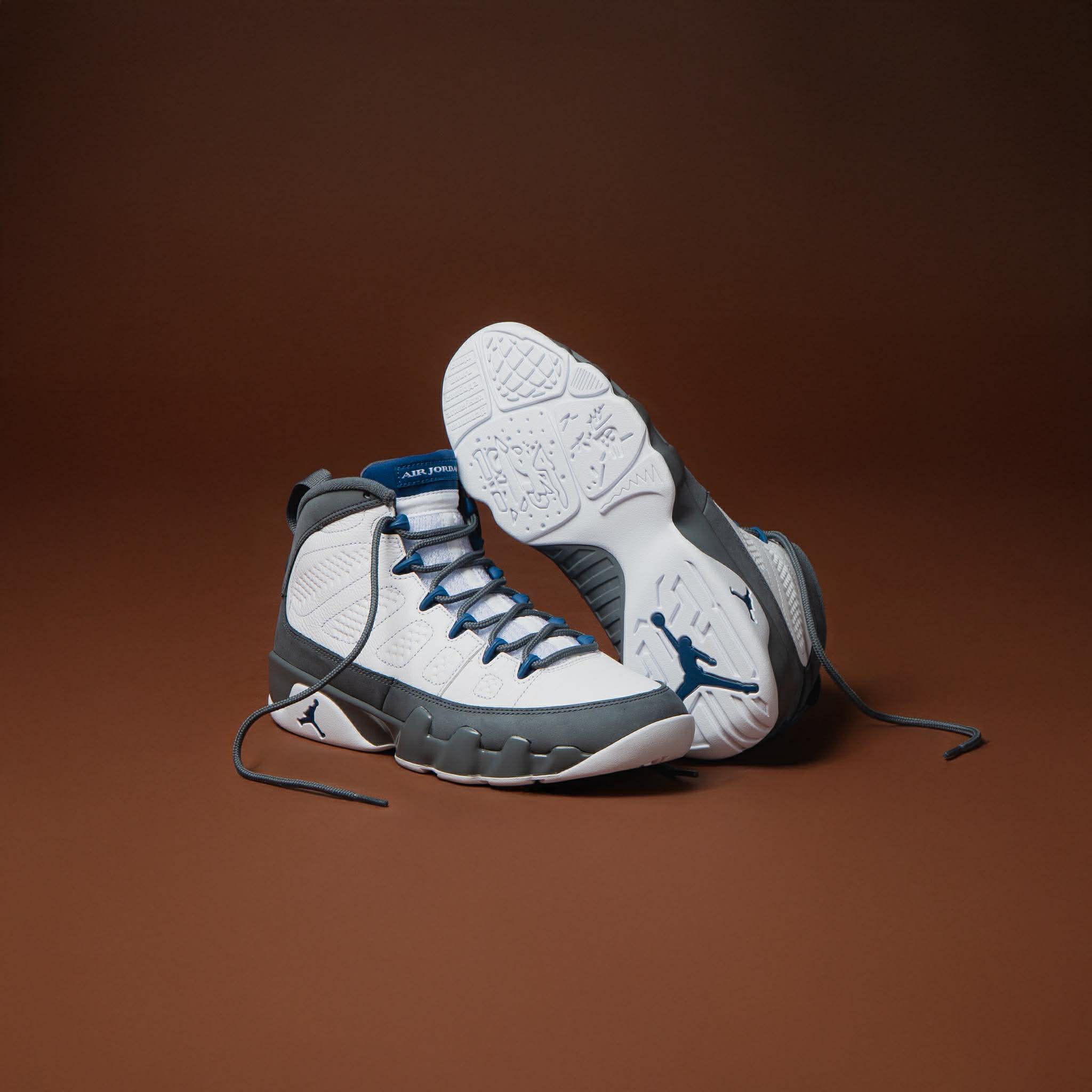 Silueta icónica Jordan 9 Retro en colorway White/French Blue. Construcción premium con detalles en azul sobre base blanca.